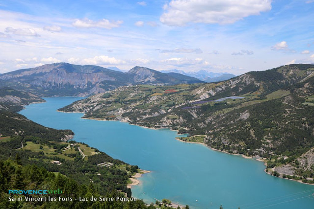It has a breathtaking view point of Serre-Ponçon lake, standing out as a blue-green splash on the green meadows surrounded by bluish mountains !